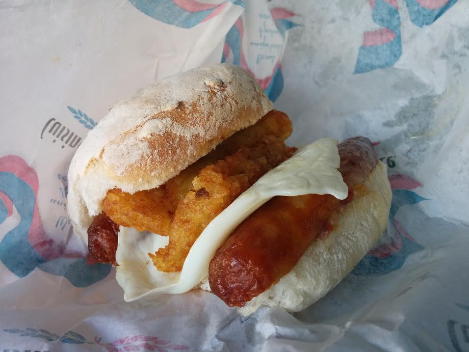 A floury bun with sliced sausage links, fried egg, hashbrowns and bacon – what’s not to love?